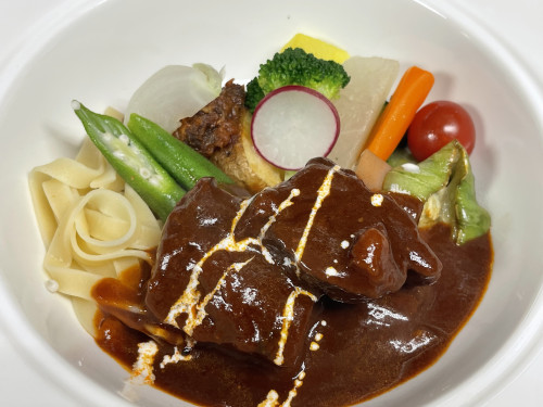 沖縄県産野菜がお皿を彩り柔らかいお肉を伝統の赤ワインソースでお楽しみいただけるコースです